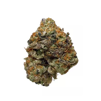 The dense and chunky nuggets are mint-green in color with patches of amber and streaks of purple. Long and coiled orange pistils run wild, while a trichome frost gives the buds a fuzzy look.