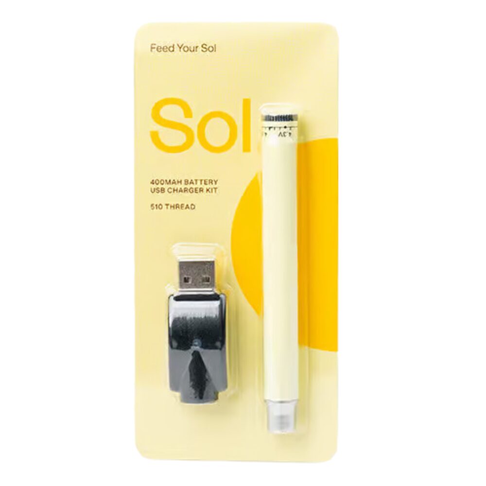 The Sol 400 mAh battery uses a 510 connection, which makes it compatible with all 510 cartridges. To charge the device, screw on the USB charger. Once you attach your cartridge and select your power setting, hold down the power button while you inhale to kickstart your journey.